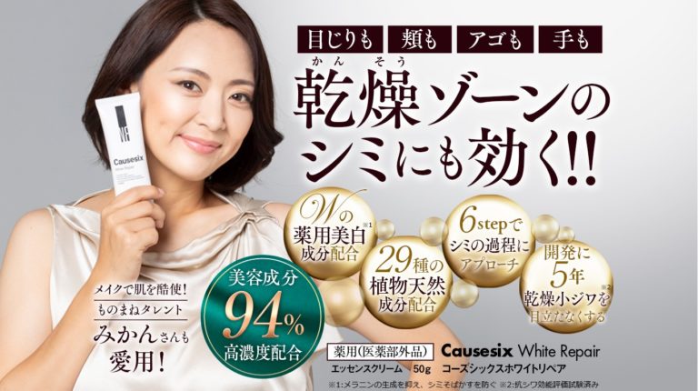 | コーズシックスとは | ものまねタレントみかんさん愛用のエッセンスクリーム。初回限定71%オフの1,980円(税抜)で送料無料。 |